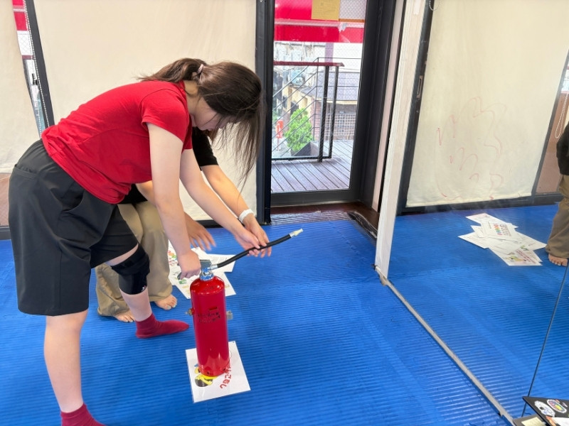 また、消火器は消防署からお借りした訓練用のものを使い、実際に操作方法を学びました。